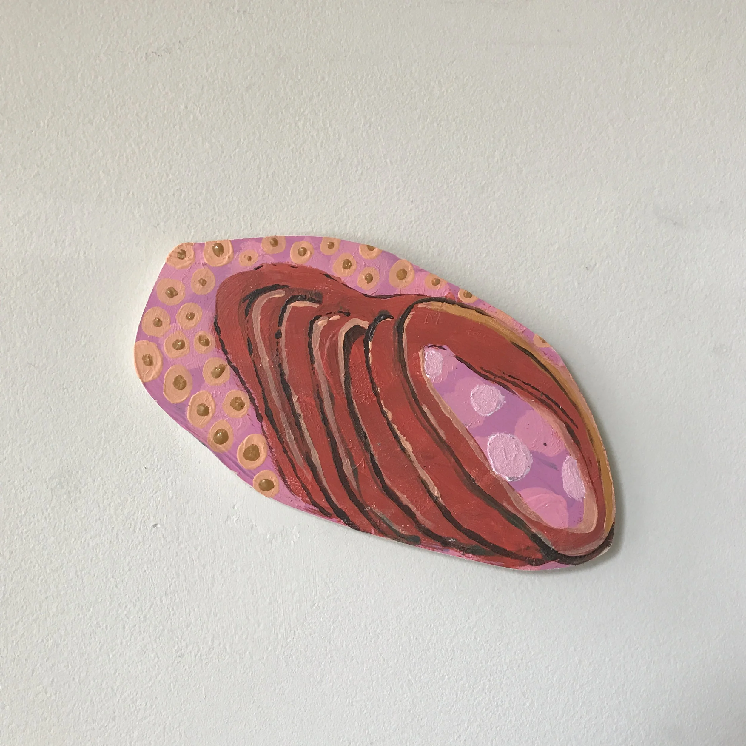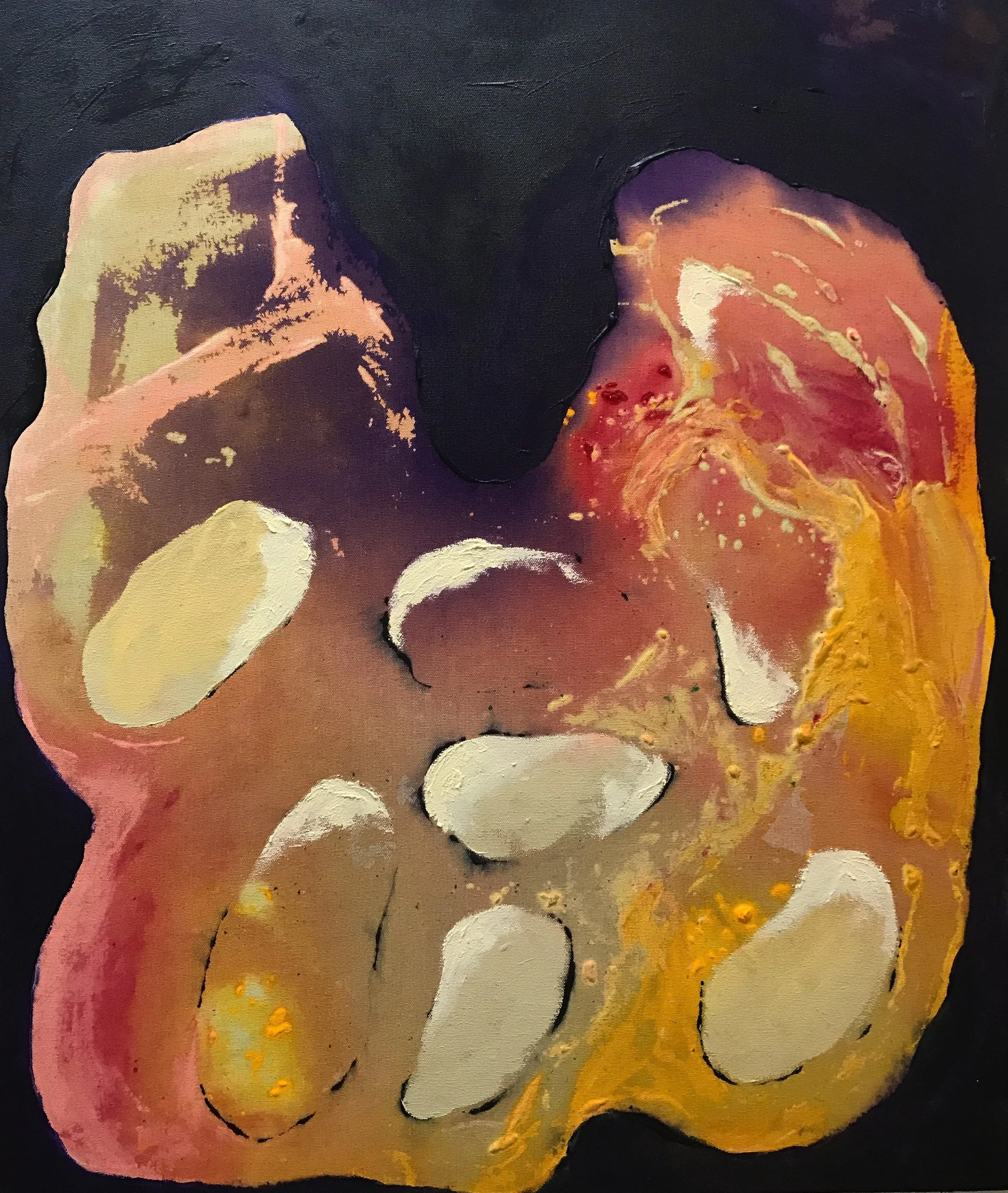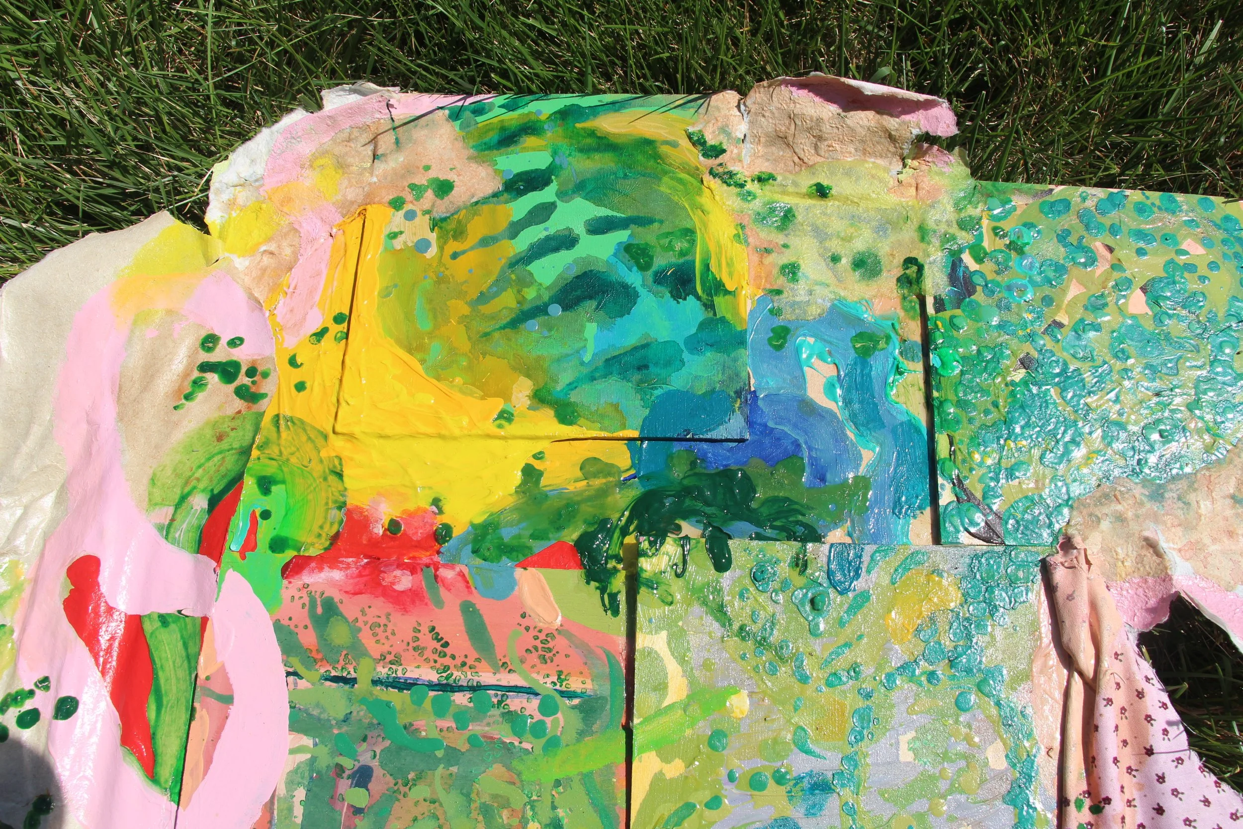 Unboxing - acrylic, spray paint, canvas, clay, wood pieces on stretched canvas