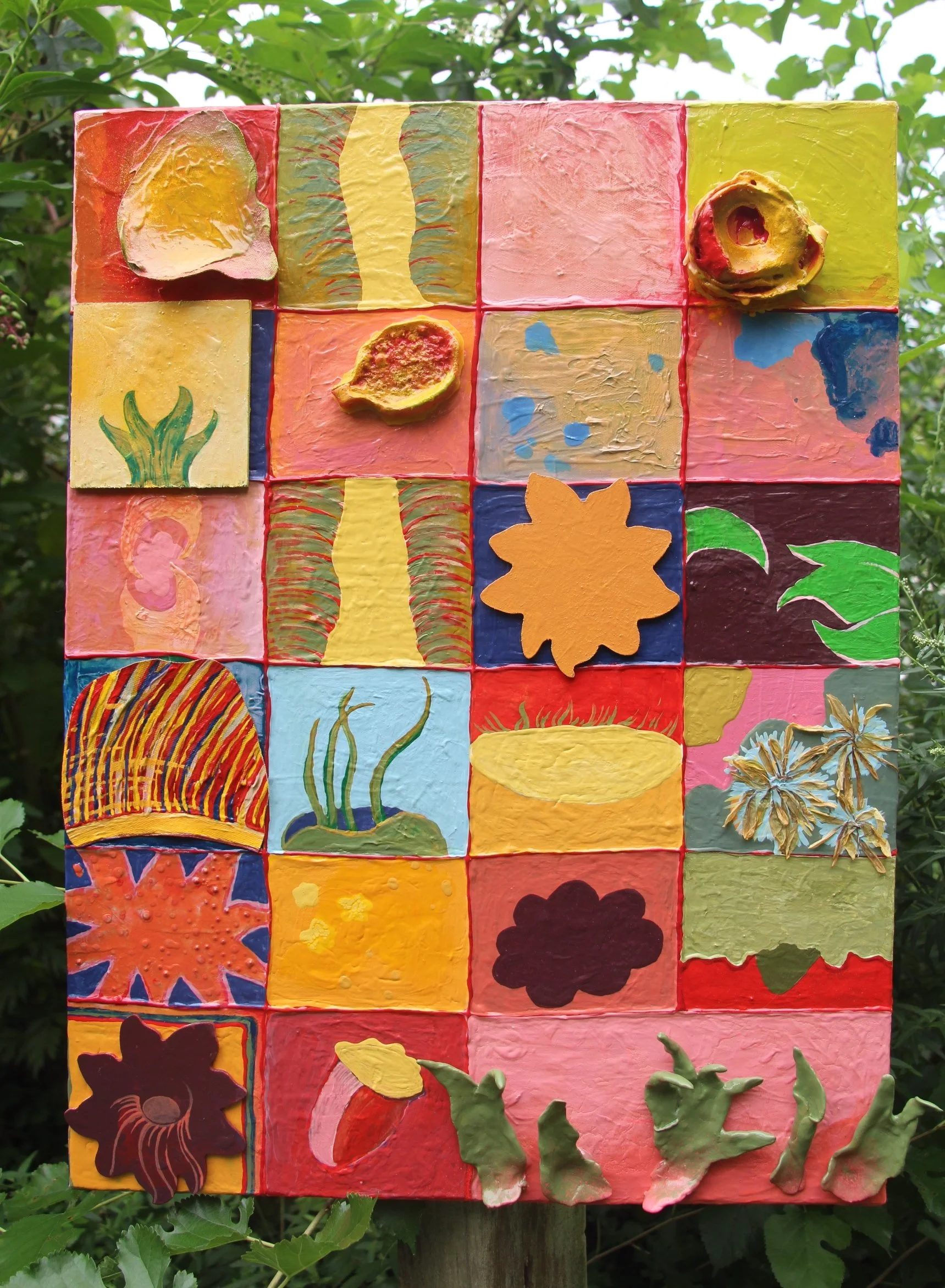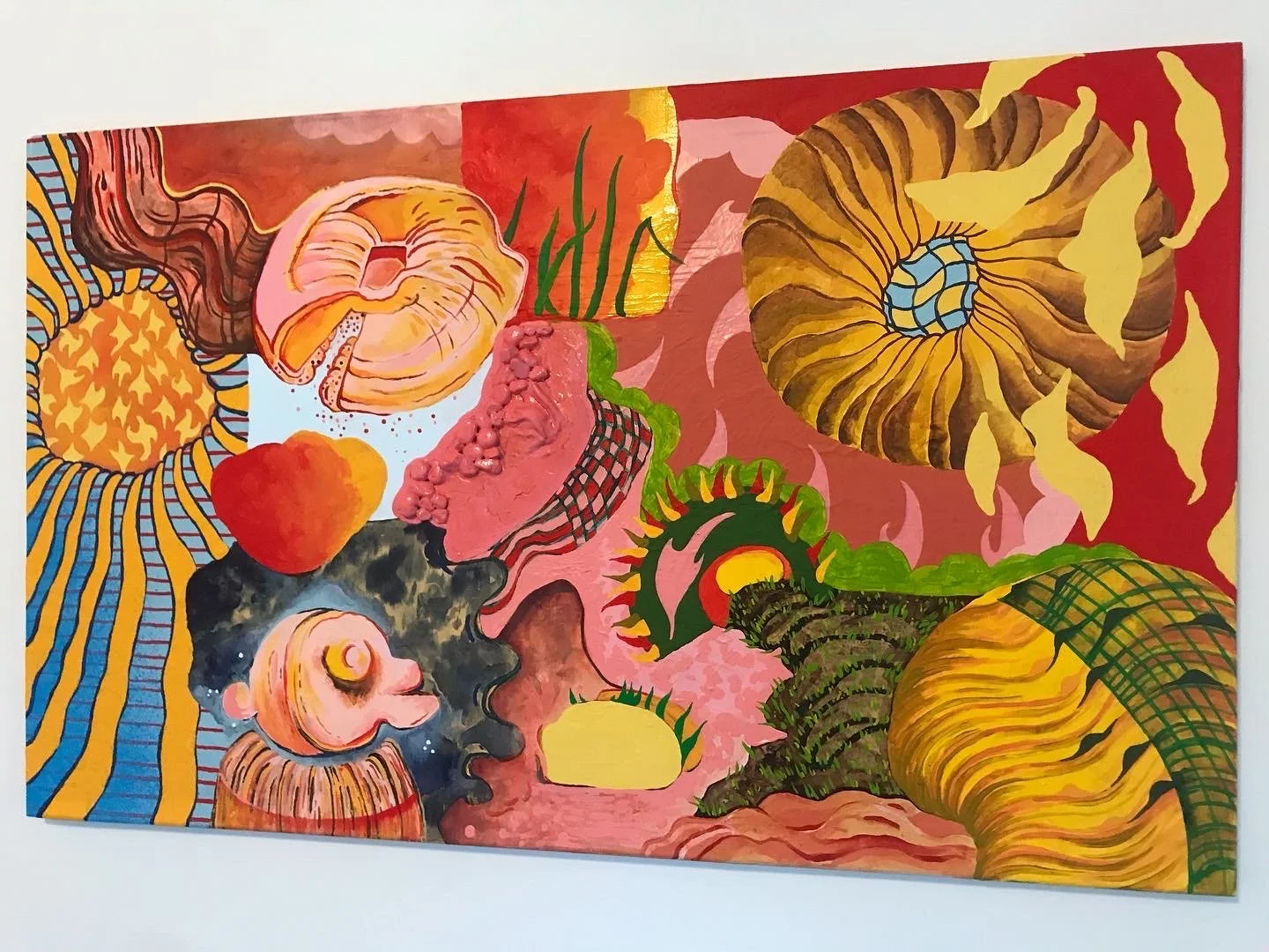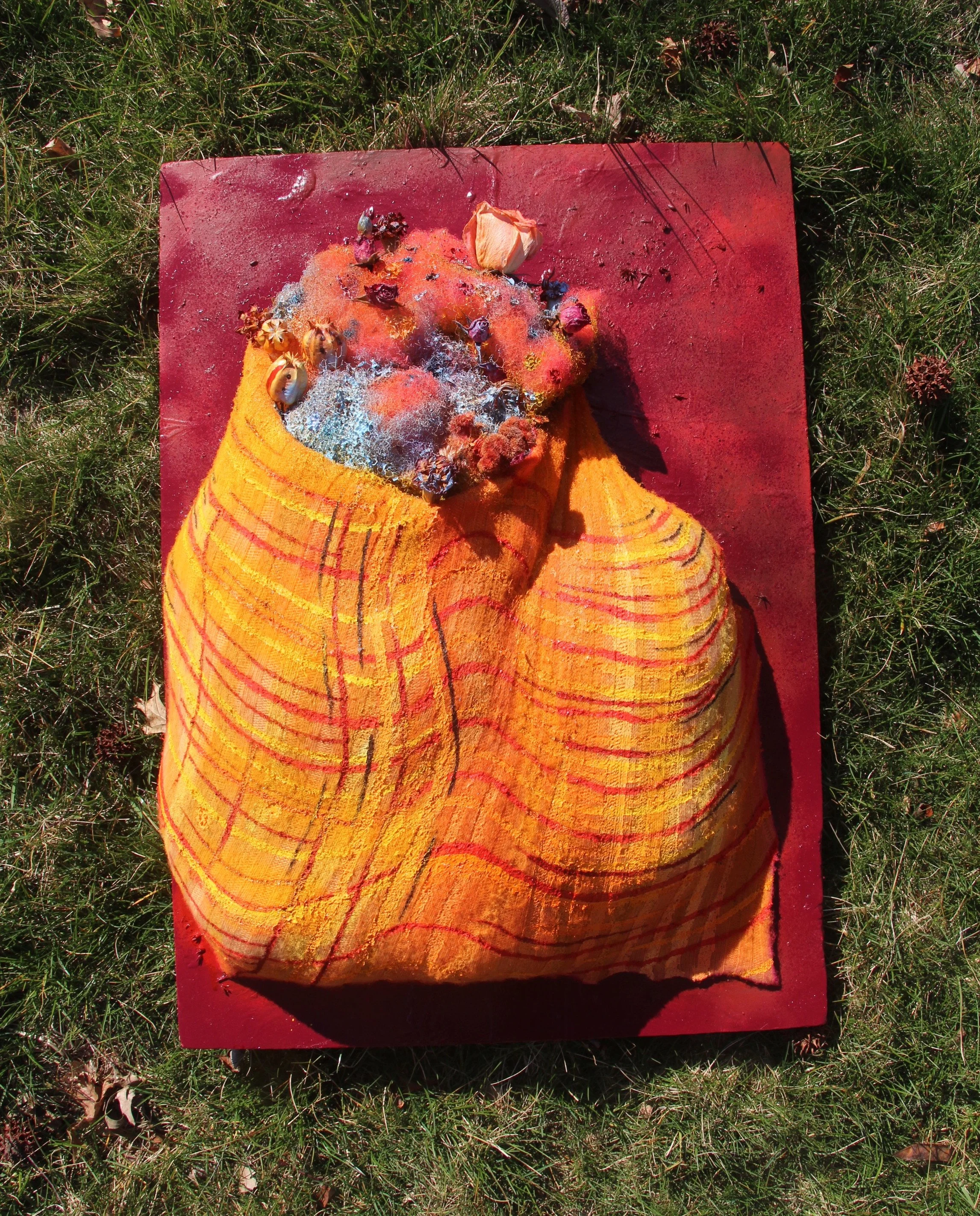 acrylic, spray paint, canvas, polyfil, dried plants/flowers on wood panel