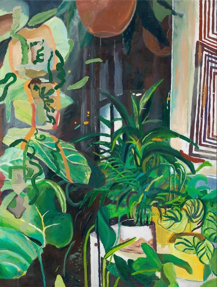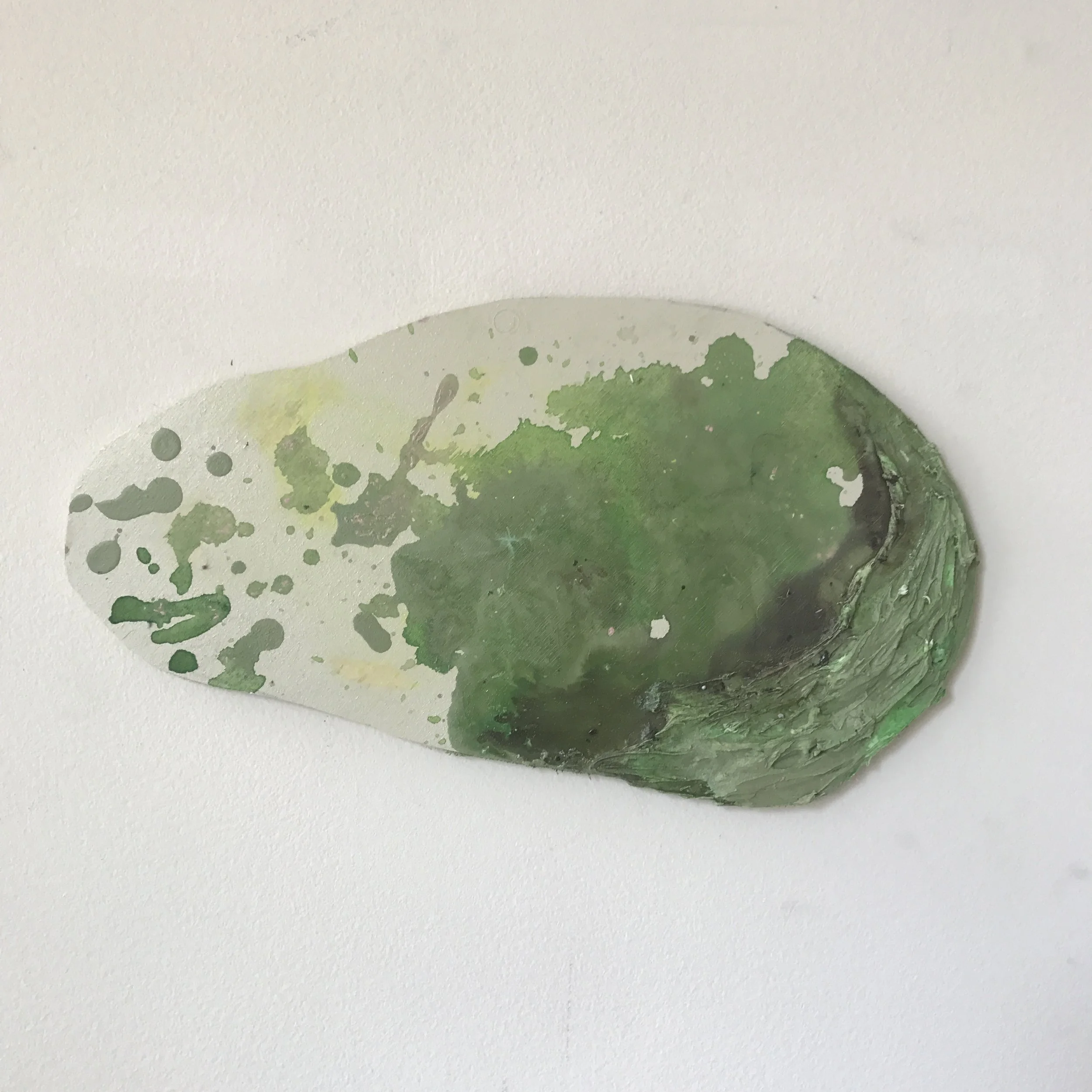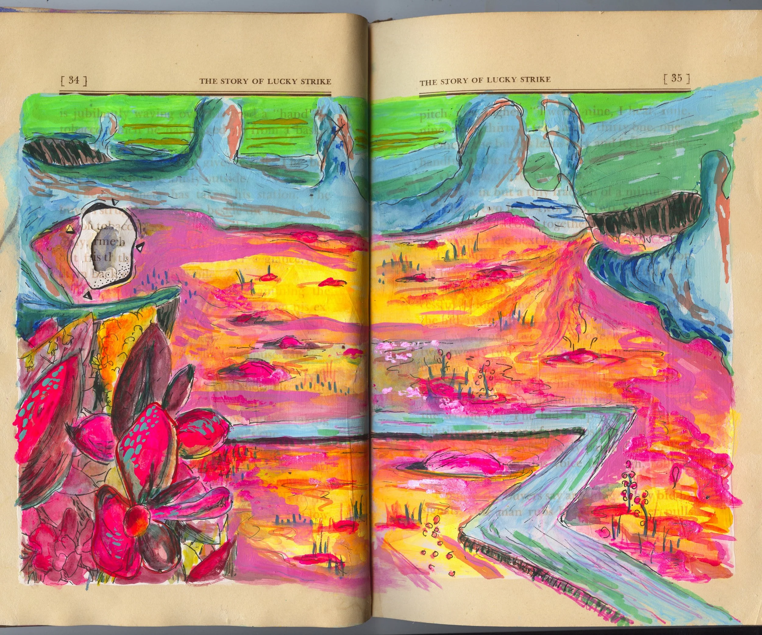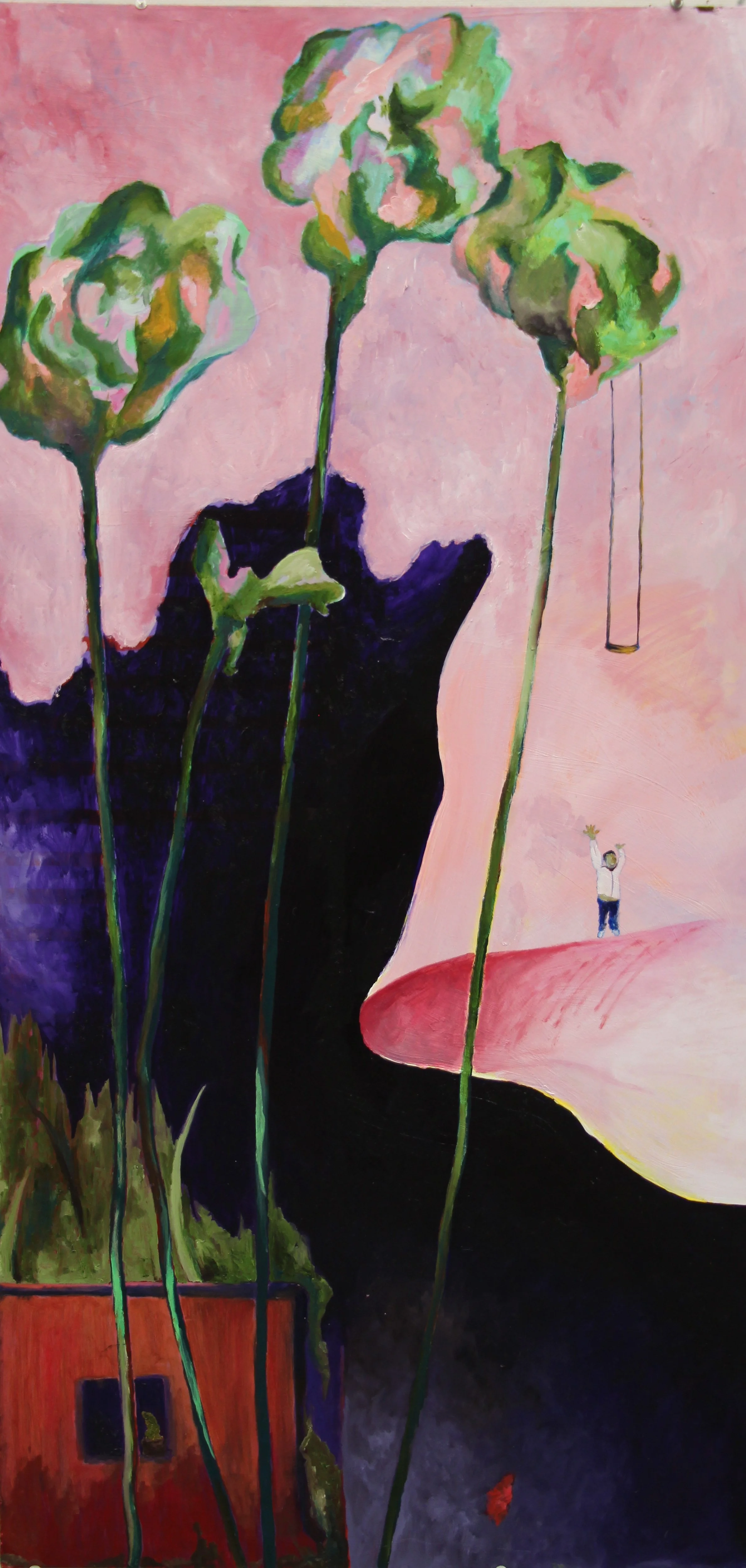 acrylic, spray paint, canvas, polyfil, dried plants/flowers on wood panel