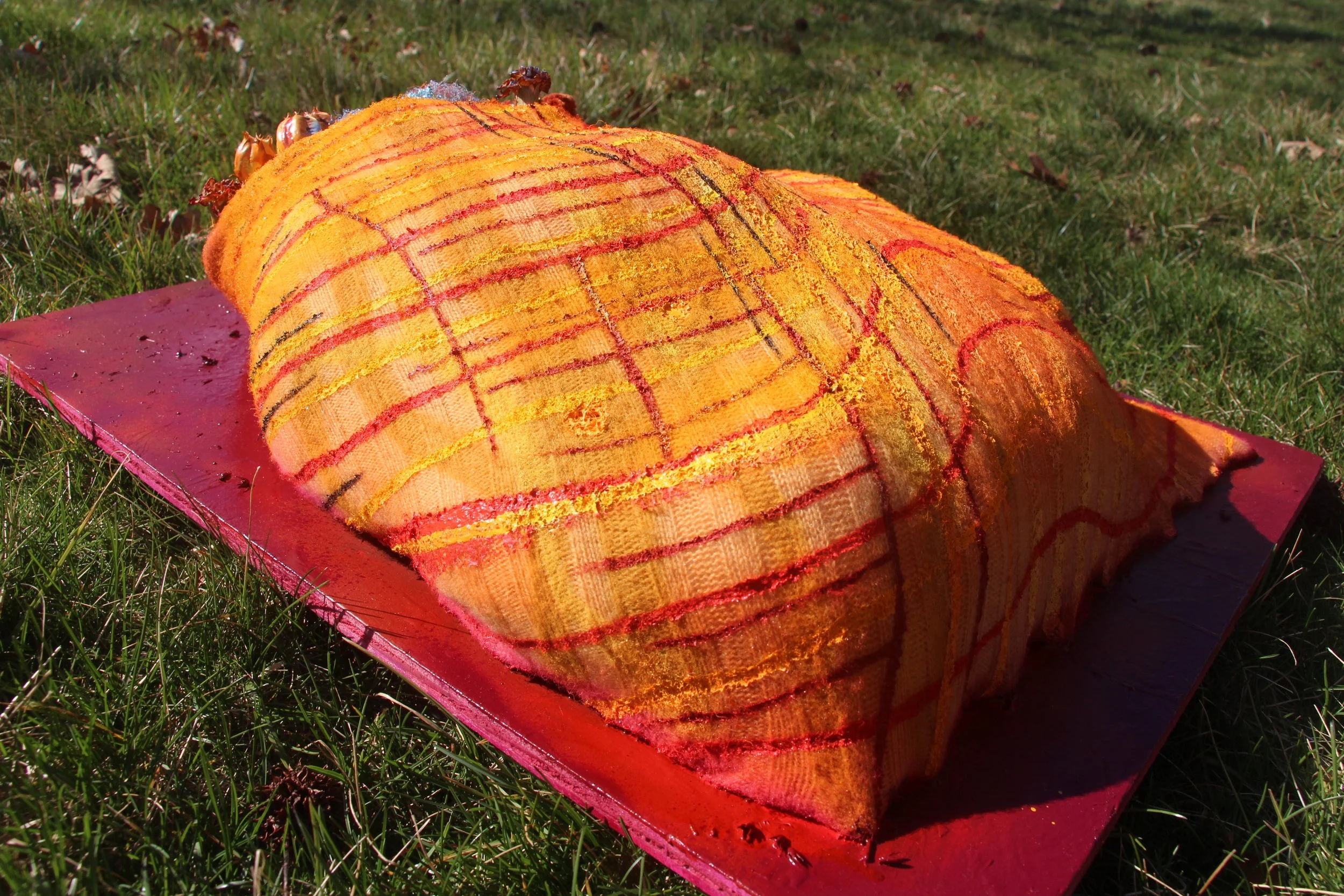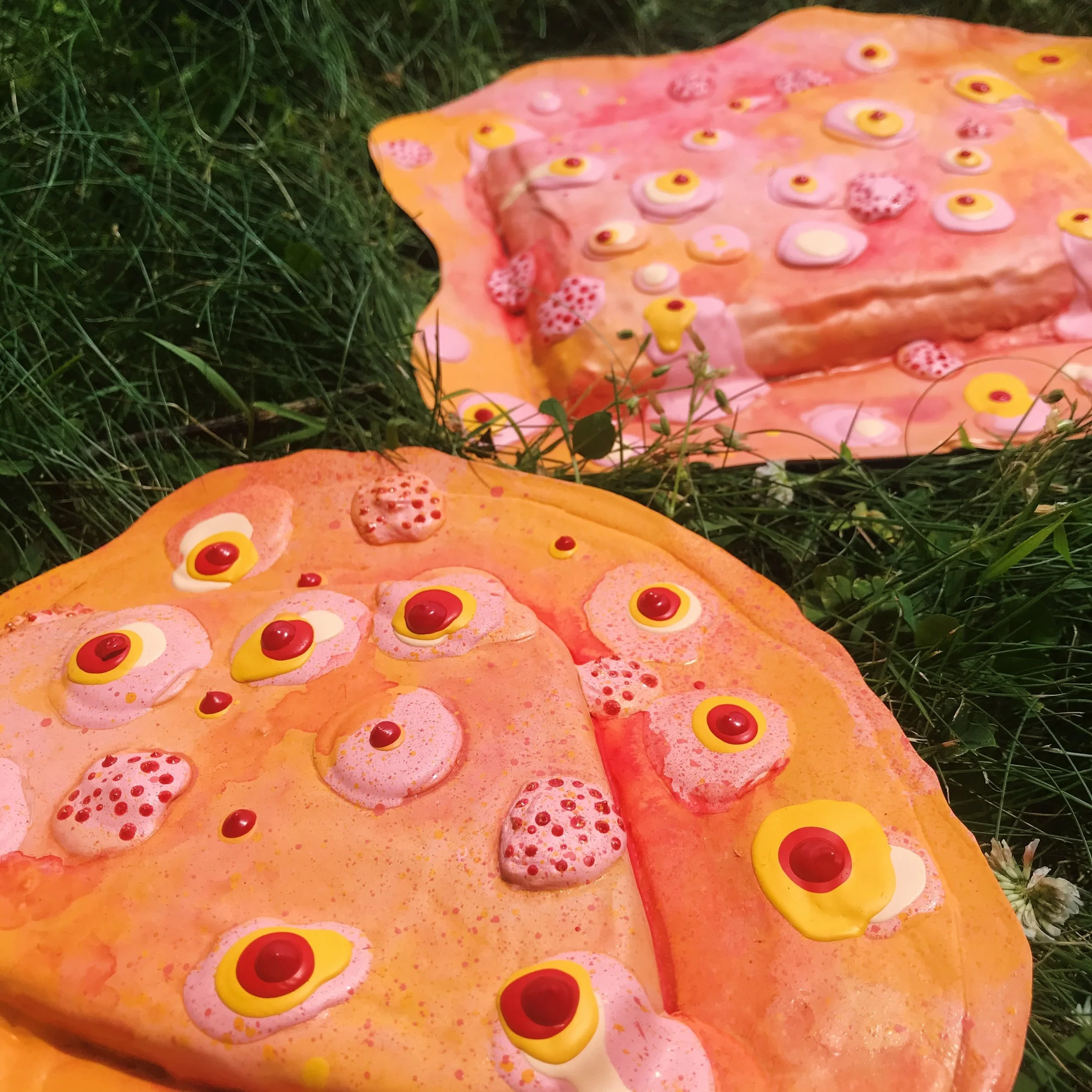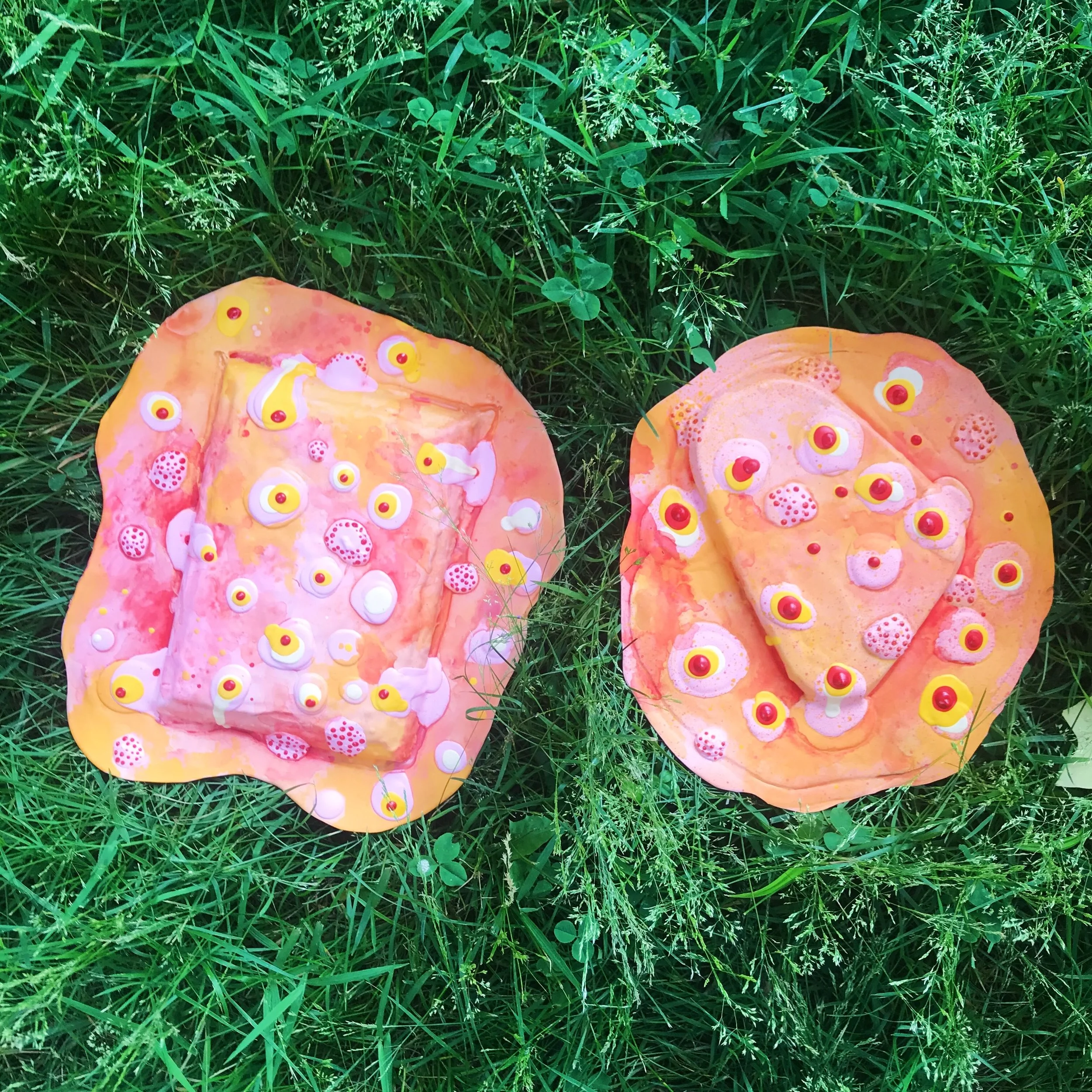 Blump - canvas, polyfil, pom poms, acrylic and spray paint on cradled wood panel